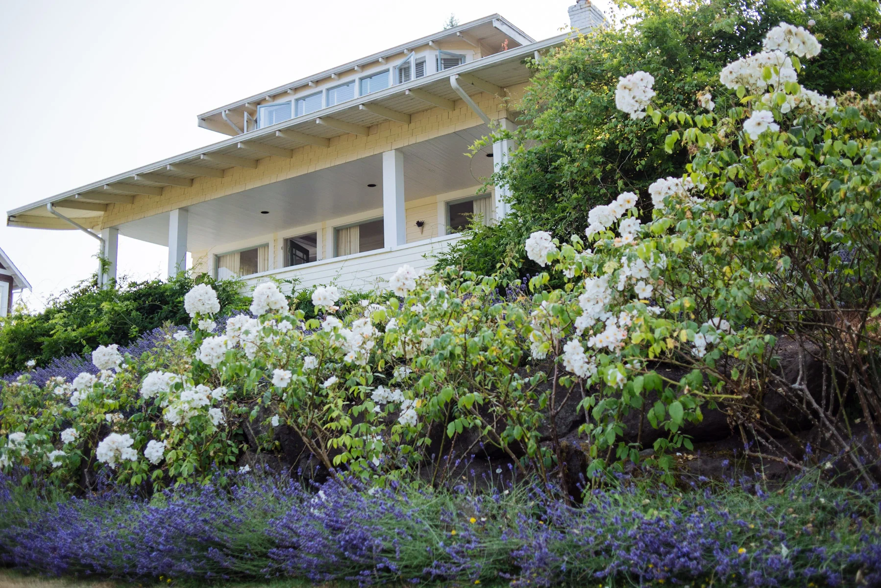 The lawn provides a large flat area for ceremonies, receptions and reunions, while the porch provides a perfect place for buffet suppers, cocktails, and acoustic music with stunning views of Mount Rainier, Quartermaster Harbor, and the lavender fields.