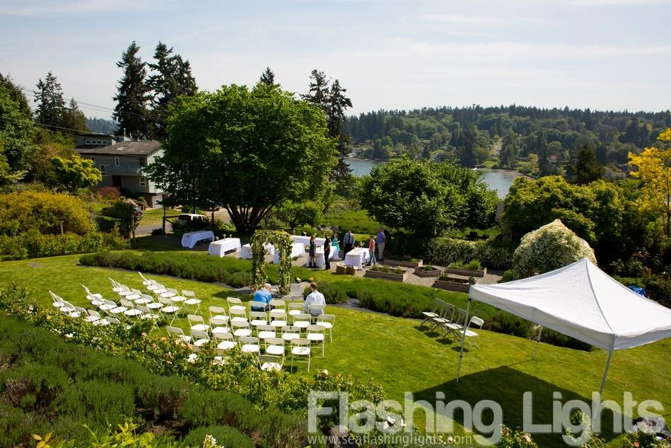 Eight hours to have the wedding or party of your dreams, plus one hour of rehearsal time during the preceding week. The wedding couple and attendants will have two bedrooms and two bathrooms for getting ready. There’s a full-length mirror, makeup table, iron and ironing board, clothing steamer and lots of outlets for blowdryers and curling irons. The bridal party can keep an eye on guests from the master bedroom overlooking the garden, the lavender, and the harbor. We hope Mt. Rainier will make an appearance on your special day!